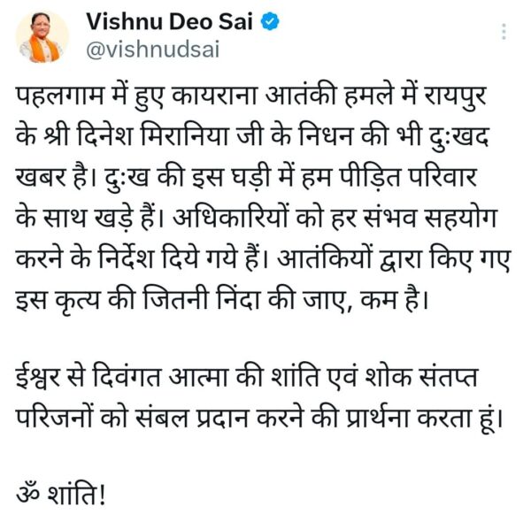 मुख्यमंत्री विष्णु देव साय ने पहलगाम आतंकी हमले में रायपुर निवासी श्री दिनेश मिरानिया के निधन पर गहरा शोक व्यक्त किया