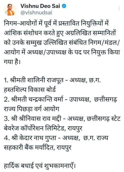 निगम आयोगों में पूर्व में प्रस्तावित नियुक्तियों में हुआ आंशिक संशोधन, मुख्यमंत्री विष्णु देव साय ने निगम/मंडल/आयोग में नियुक्त अध्यक्षों एवं उपाध्यक्ष को दी शुभकामनाएं