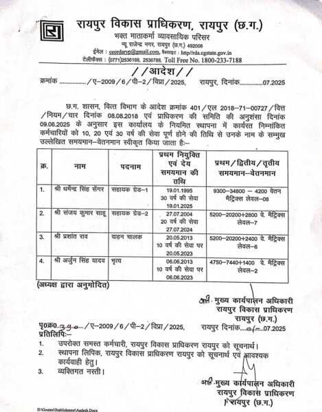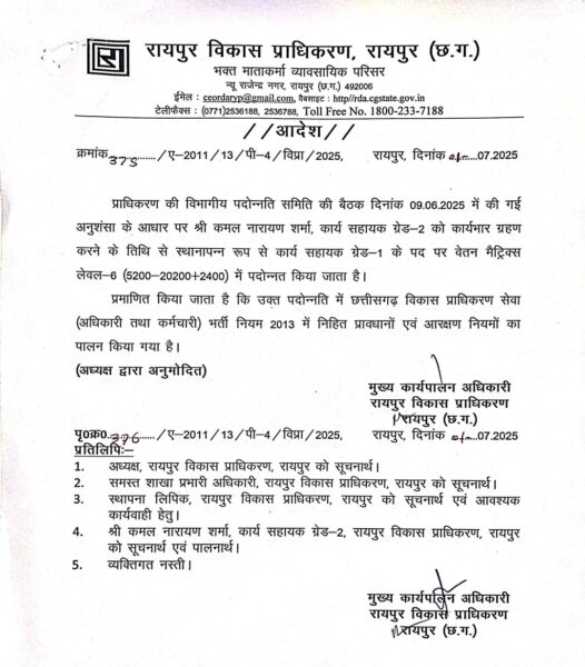 रायपुर विकास प्राधिकरण के कर्मचारियों की पदोन्नति/क्रमोन्नति के आदेश जारी ।