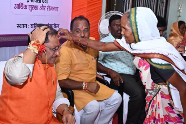 रायपुर 09 अगस्त 2025/मुख्यमंत्री श्री विष्णु देव साय के गृह ग्राम बगिया स्थित कैंप कार्यालय में रक्षाबंधन के अवसर पर विभिन्न योजनाओं से लाभान्वित बहनों ने राखी बांधकर आभार व्यक्त किया। प्रधानमंत्री आवास योजना, महतारी वंदन योजना की हितग्राही दीदियों के साथ आंगनबाड़ी कार्यकर्ता-सहायिकाएँ, मितानिन और स्व-सहायता समूह की बहनों ने भी मुख्यमंत्री श्री साय की कलाई पर राखी बांधी और उनके दीर्घायु की कामना की।