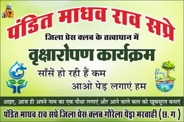गौरेला-पेंड्रा- मरवाही पर्यावरण संरक्षण और हरियाली को बढ़ावा देने के उद्देश्य से पं. माधवराव सप्रे जिला प्रेस क्लब के तत्वावधान में 18 अगस्त को वृहद वृक्षारोपण कार्यक्रम का आयोजन किया जा रहा है। यह कार्यक्रम दोपहर 12 बजे प्रेस क्लब परिसर, कृषि मंडी रोड पेंड्रा में होगा।