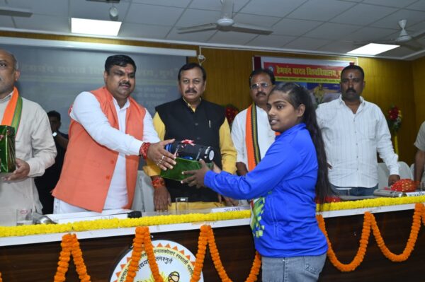 समारोह में विश्वविद्यालय के 34 विद्यार्थियों को राष्ट्रीय स्तर की खेल प्रतियोगिताओं में उत्कृष्ट प्रदर्शन के लिए सम्मानित किया गया। मंत्री श्री यादव ने उन्हें शुभकामनाएँ देते हुए विश्वास व्यक्त किया कि दुर्ग के खिलाड़ी अब राष्ट्रीय ही नहीं, बल्कि अंतर्राष्ट्रीय स्तर पर भी अपनी पहचान बनाएंगे।