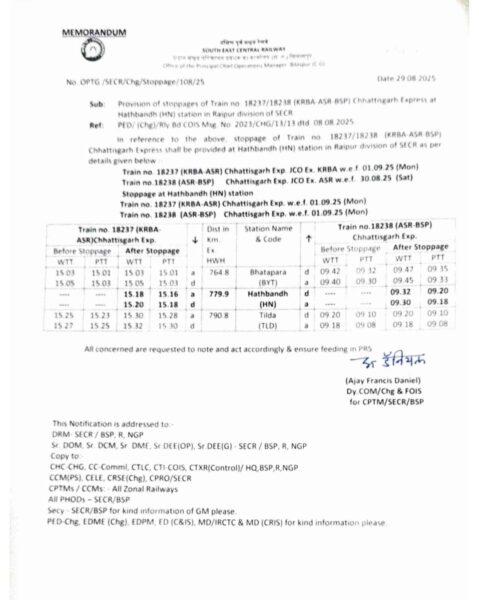 छत्तीसगढ़ के रेल यात्रियों के लिए बड़ी सौगात देते हुए भारतीय रेलवे ने कोरबा-अमृतसर छत्तीसगढ़ एक्सप्रेस (18237/18238) का हथबंद स्टेशन पर ठहराव पुनः प्रारंभ करने का निर्णय लिया है।