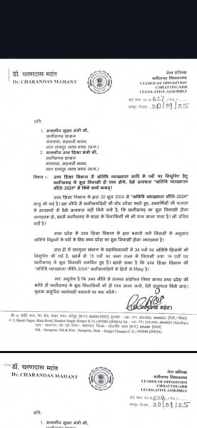 रायपुर । छत्तीसगढ़ विधानसभा नेता प्रतिपक्ष डॉ. चरणदास महंत ने उच्च शिक्षा विभाग में गैर छत्तीसगढ़ियों की नियुक्ति एवं स्थानीय छत्तीसगढ़ियों की अपेक्षा को लेकर प्रदेश के मुख्यमंत्री विष्णुदेव साय को पत्र लिखा है।