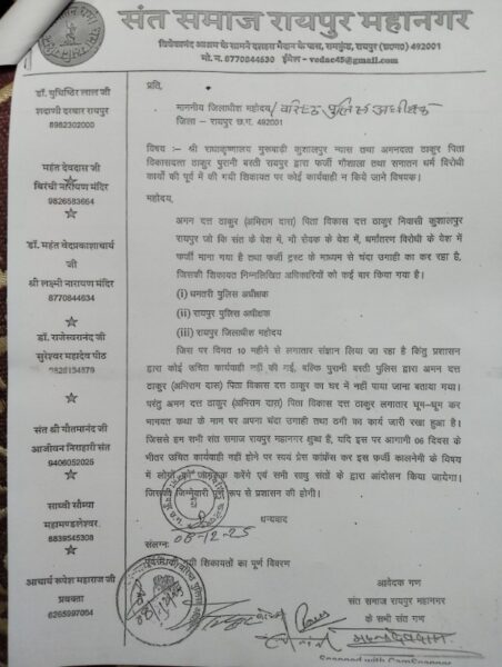रायपुर/ देश – प्रदेश में सनातन धर्म के नाम पर झूठी अपवाहें फैलाना, धर्म के नाम पर लोगों को फर्जी तरीके से बरगलाना , धर्म परिवर्तन करवाना यह मामला दिनों दिन बढ़ता ही जा रहा है । ऐसे में सनातन धर्म के संतों ने हिंदू धर्म की रक्षा और सनातनियों को एक जुट करने का बीड़ा उठाया है।