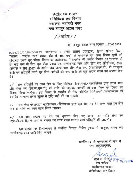 मुख्यमंत्री विष्णु देव साय ने संघ की 100 वर्षों की गौरवगाथा पर आधारित फिल्म ‘शतक’ को छत्तीसगढ़ में टैक्स-फ्री करने की घोषणा की